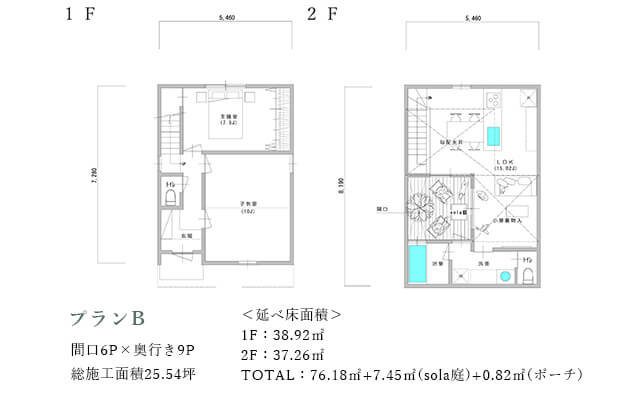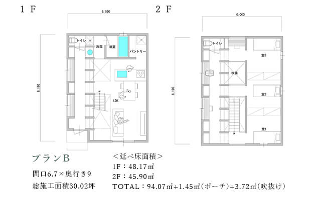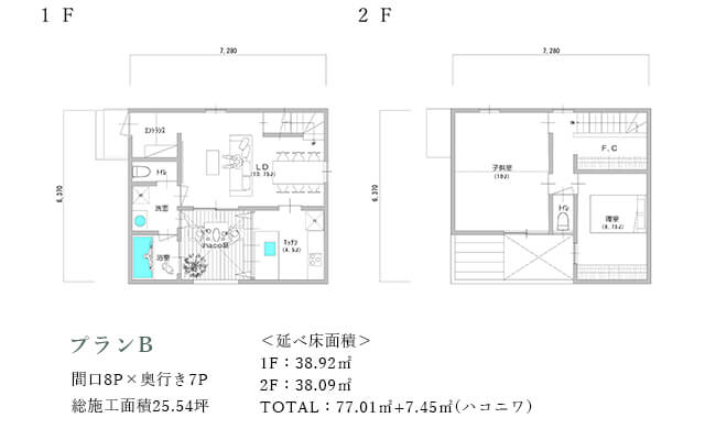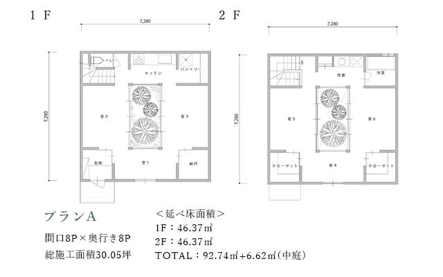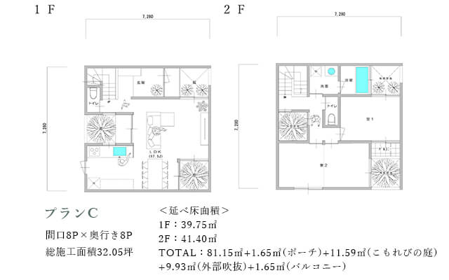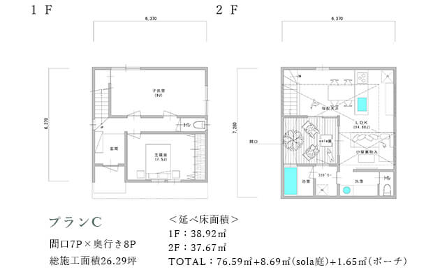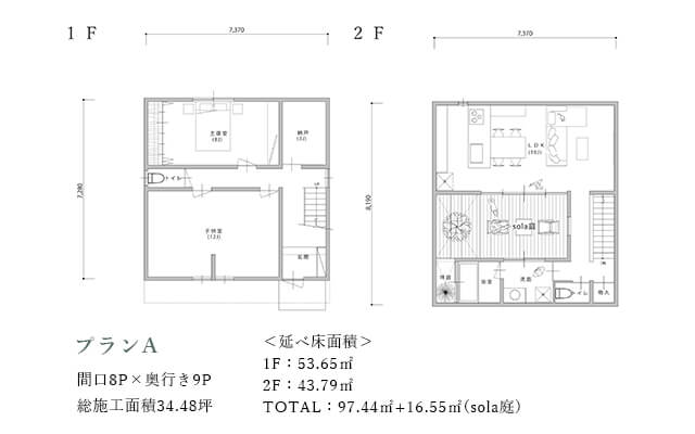 LDKに対してsola庭を挟んで南側に水周りを配置する事でプライバシーを保ちながら明るさを室内へ取り込みます。