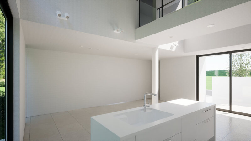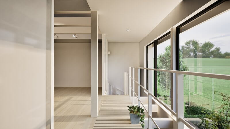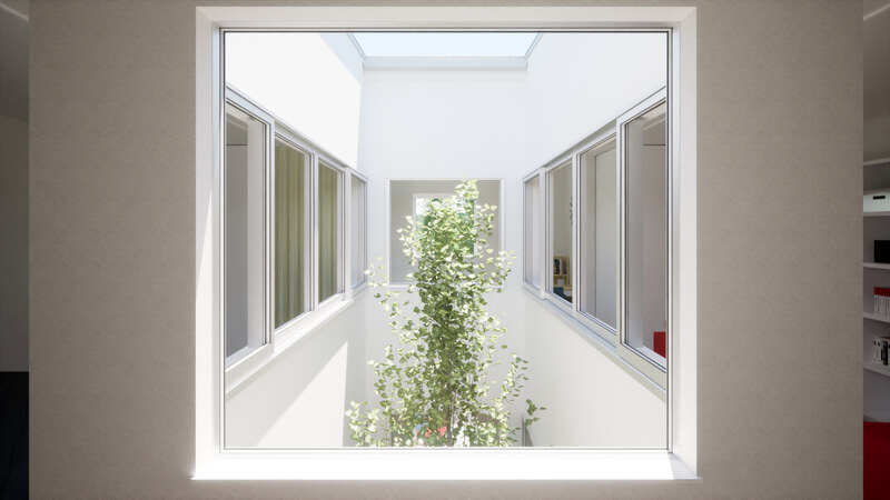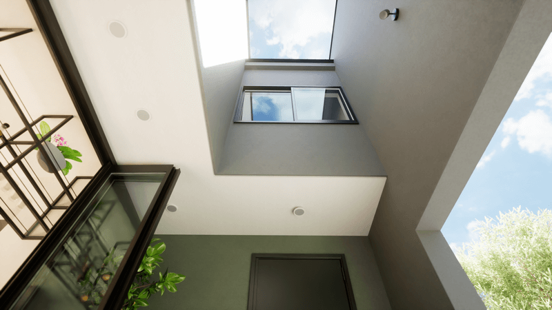 吹抜けに設けた、空に向かって開くひとつの大きな窓。