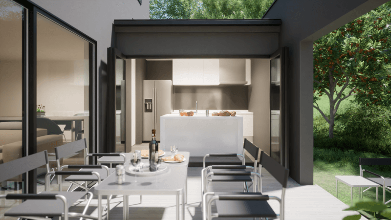 キッチンの窓を全開にすれば庭と一体化したアウトドアキッチンに。