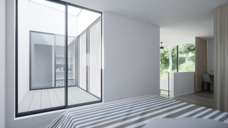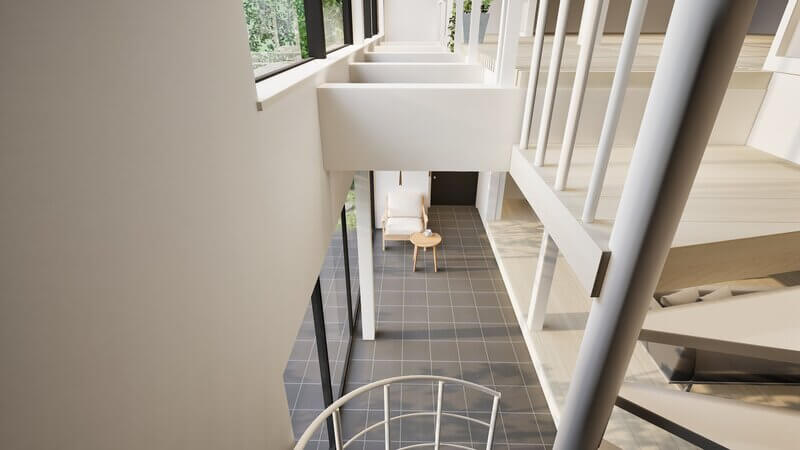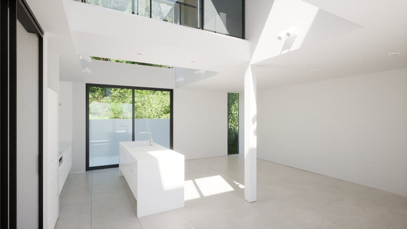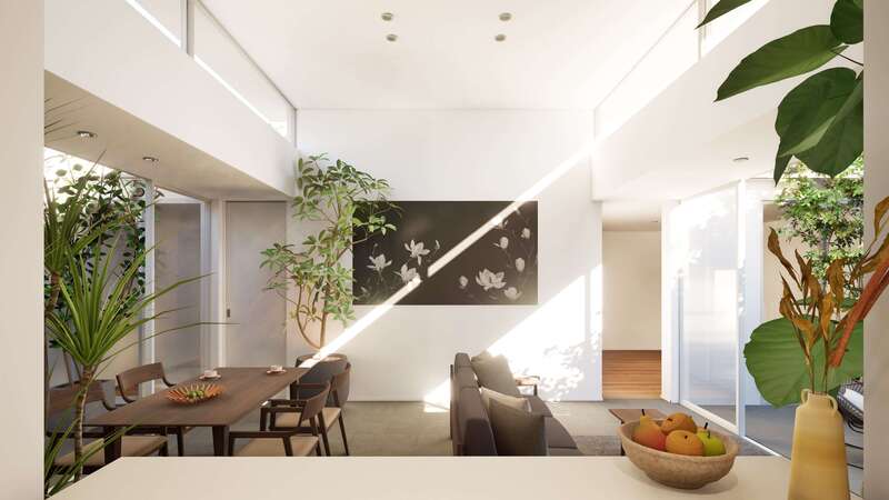上階やペントハウスから複数に散りばめられた吹抜を通して建物の奥まで光を届けます。