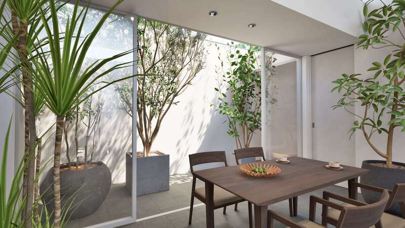 キッチン、浴室、リビングに囲まれたhaco庭。