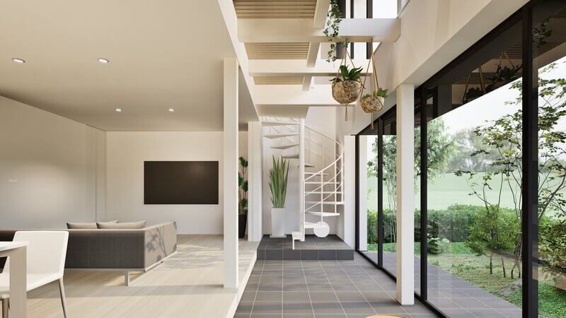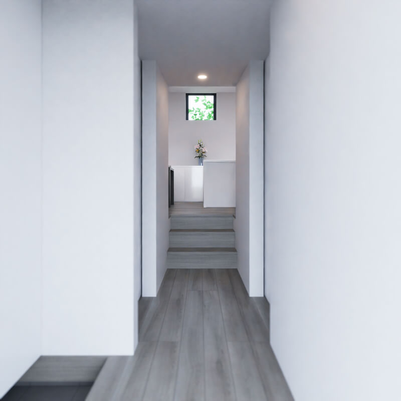 「陽だまり」は、そんな土間縁に、玄関や螺旋階段を取り込み、常に家族が行き交う場としてその魅力を再構築したプランです。