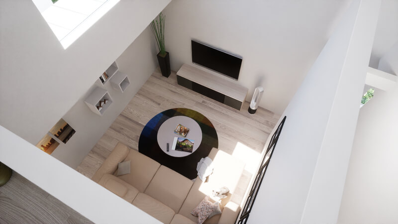 スキップフロアの4層空間では、緩やかな高低差により視線が上下に抜け、家じゅうどこにいても家族の気配を感じられる開放的な空間を実現。