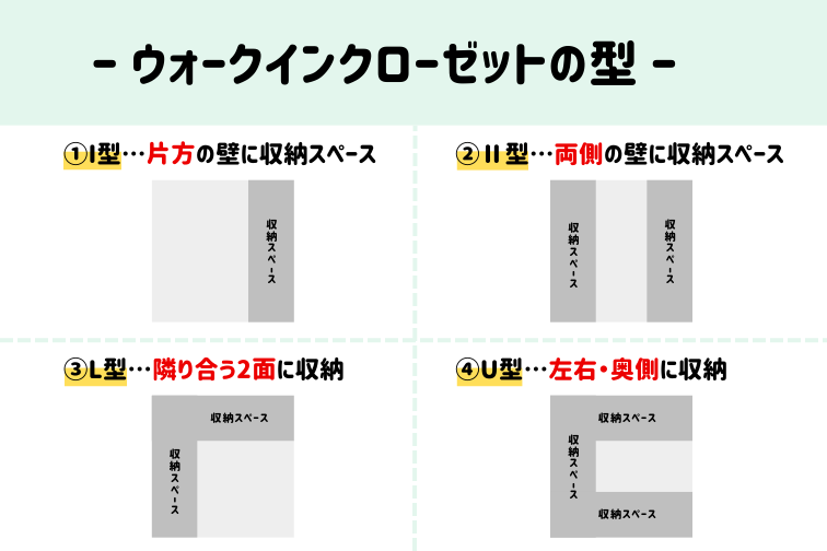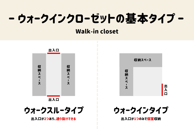 一方でウォークインタイプは、収納スペースをしっかり確保できるため、季節物や家族全員の衣類をまとめて管理したい場合に向いています。
