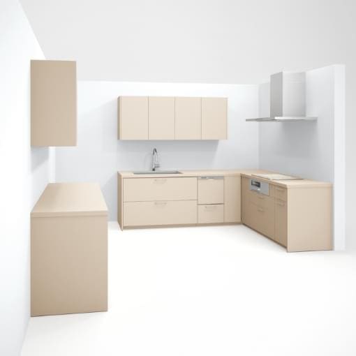 シンク・加熱機器が壁側に配置され、お手入れがしやすくリビングスペースも確保しやすいレイアウトです。