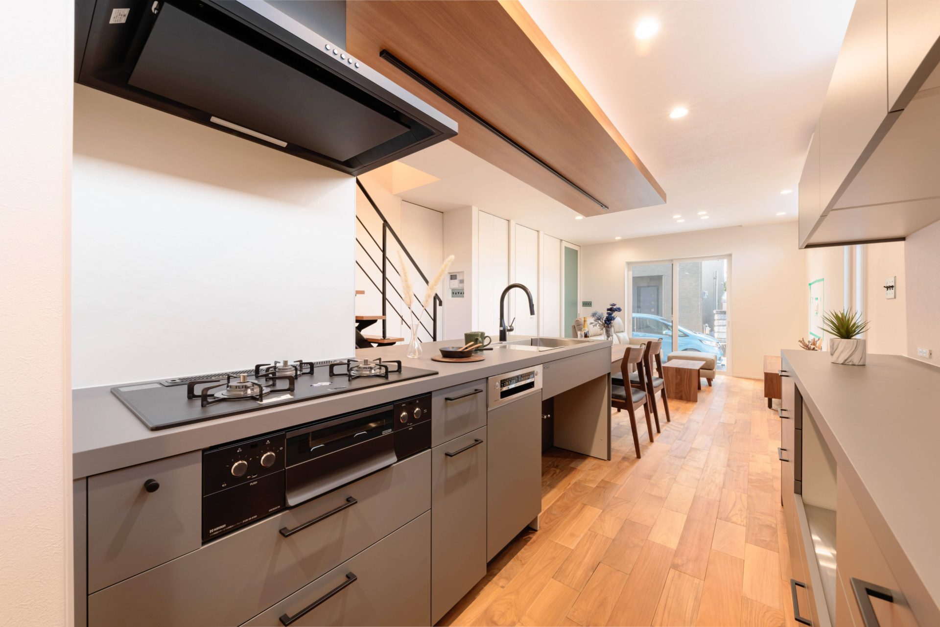 シンク・加熱機器が壁側に配置しており、広い作業スペースを確保しつつリビングスペースもゆったりと確保できるレイアウトです。