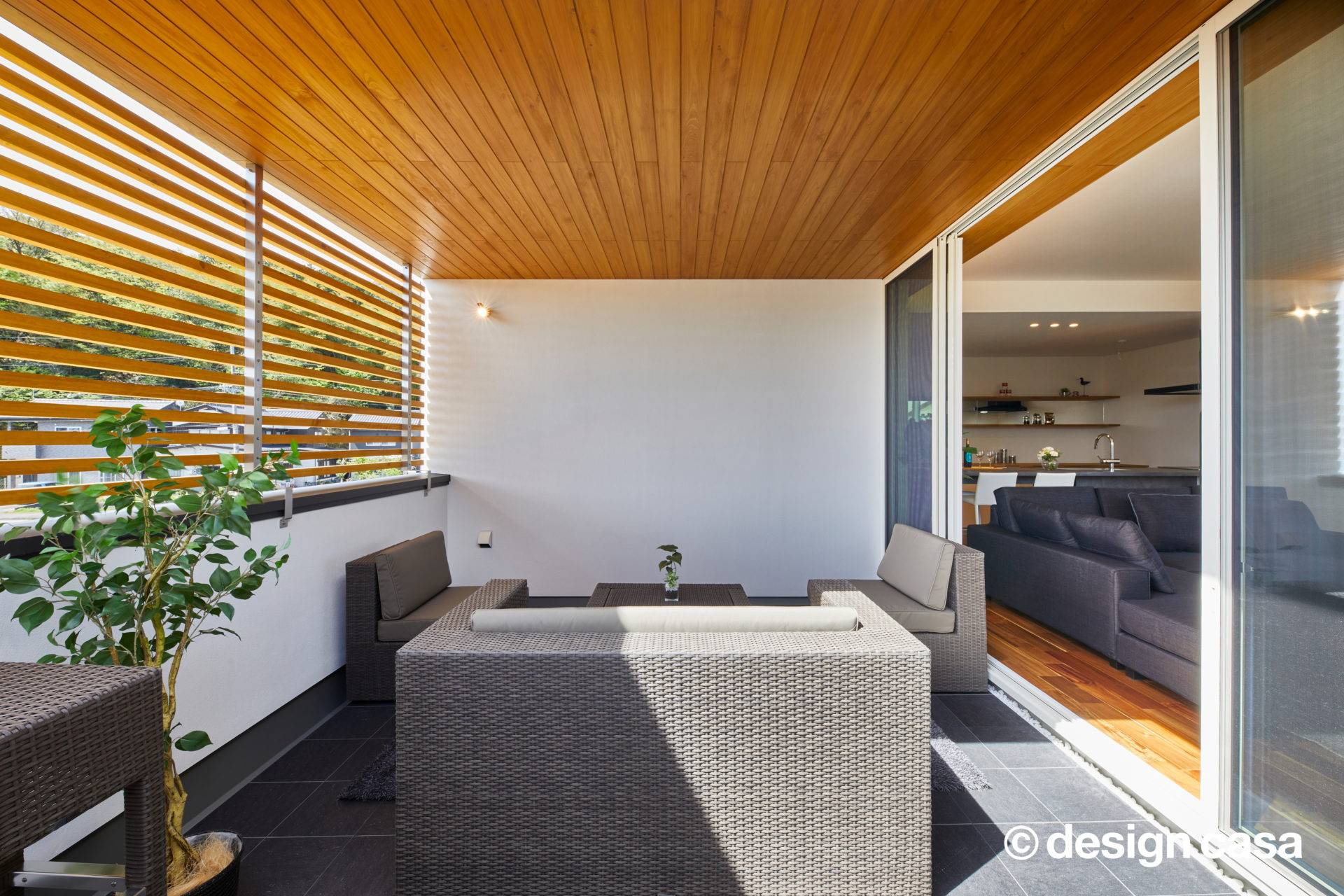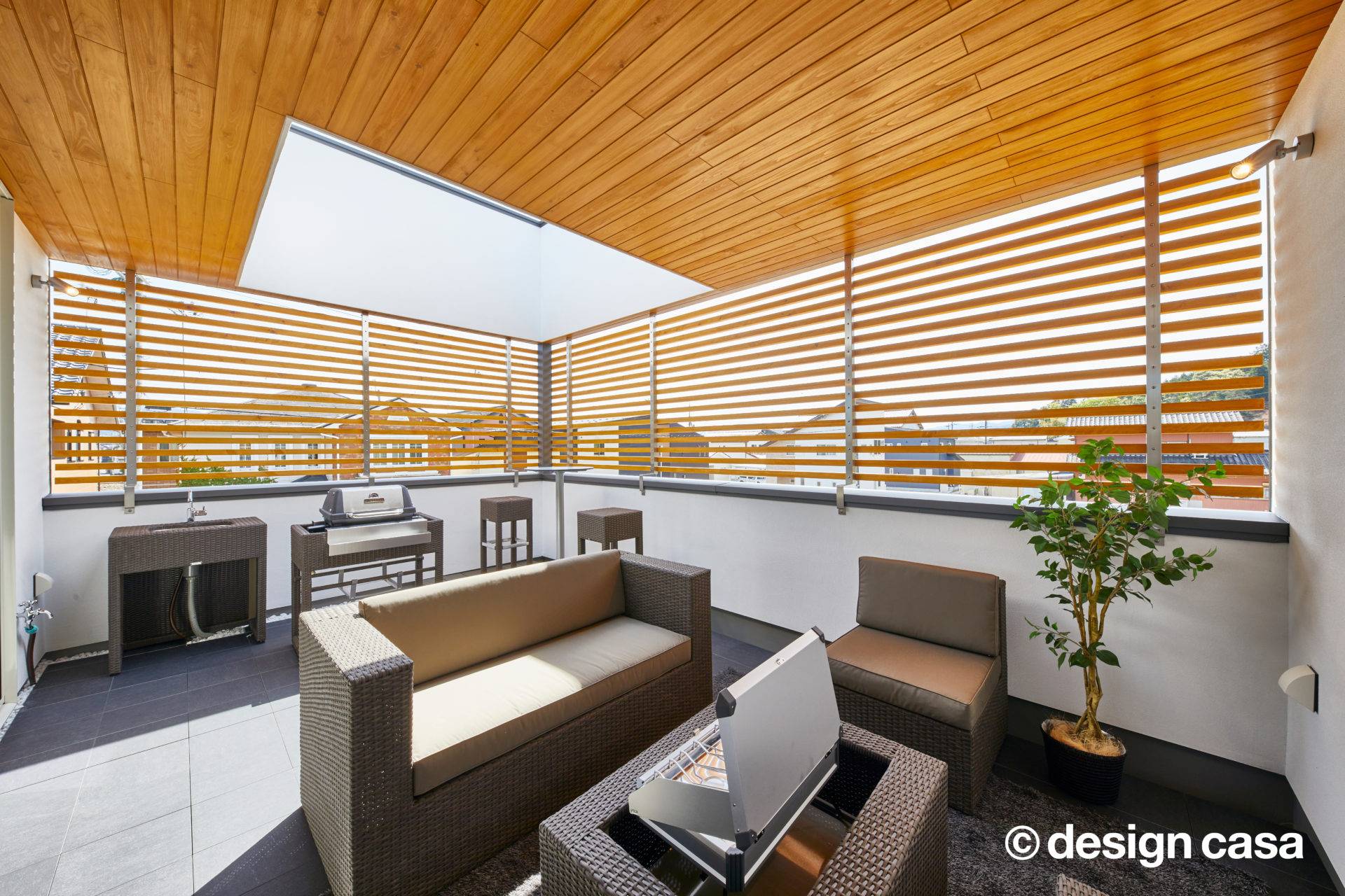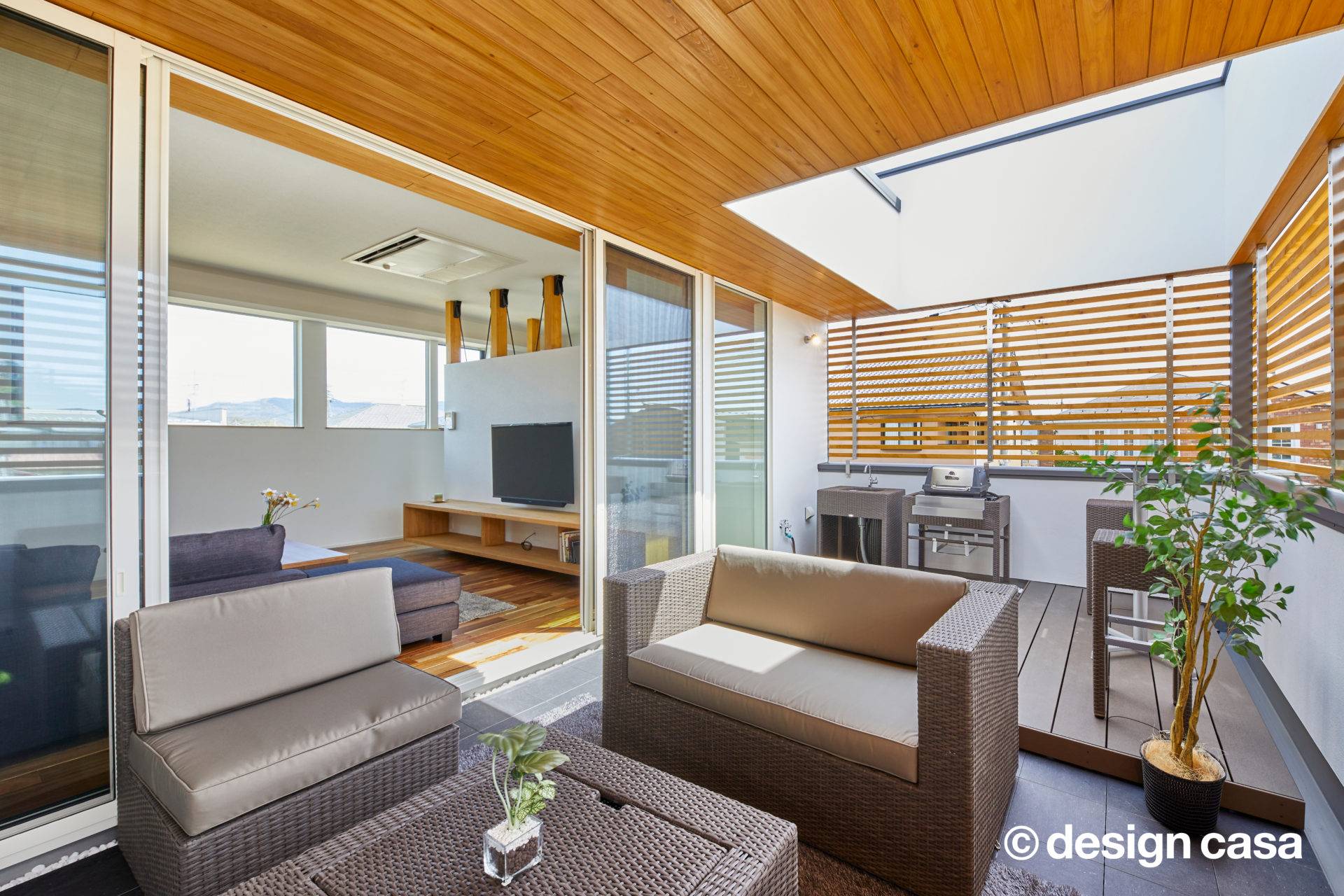 ダイニングの窓からつながるバルコニーには、ソファーやテーブル、水道が備えられ、バーベキューやくつろぎの時間を屋外で満喫できます。屋根付きのスペースは雨の日も安心で、吹き抜け部分からは空が広がり、自然を感じながら過ごせる設計です。