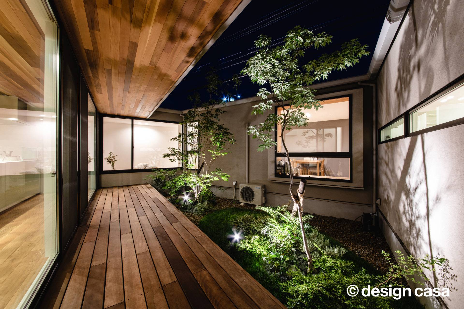 日が暮れると中庭にあかりが灯り、家の中心にやわらかな光が広がります。ライトアップされた木々が静かな夜に彩りを添え、一日の終わりにそっと寄り添ってくれるような時間が生まれます✨