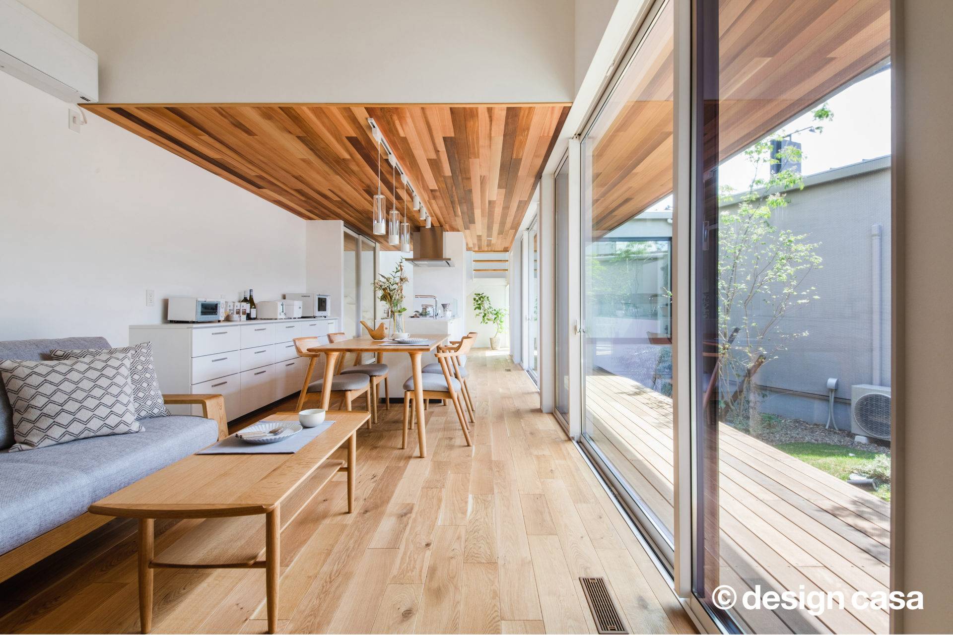 リビングや各部屋から眺められる中庭には、植えられた木々がやさしく風に揺れ、縁側のように外とつながる空間からは気軽に庭へ出られ、光や風を感じながら過ごす時間が日常にゆとりを生み出します。