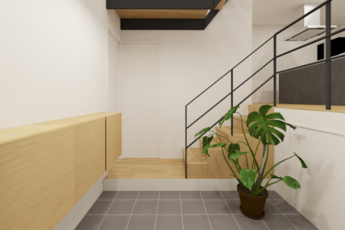 見下ろせばエントランス土間、見上ればリビング空間があり、目線が上下に抜け、空間の広がりを感じつつ、家族の気配を感じる空間構成。 -