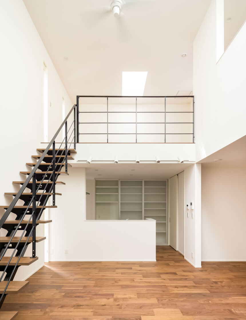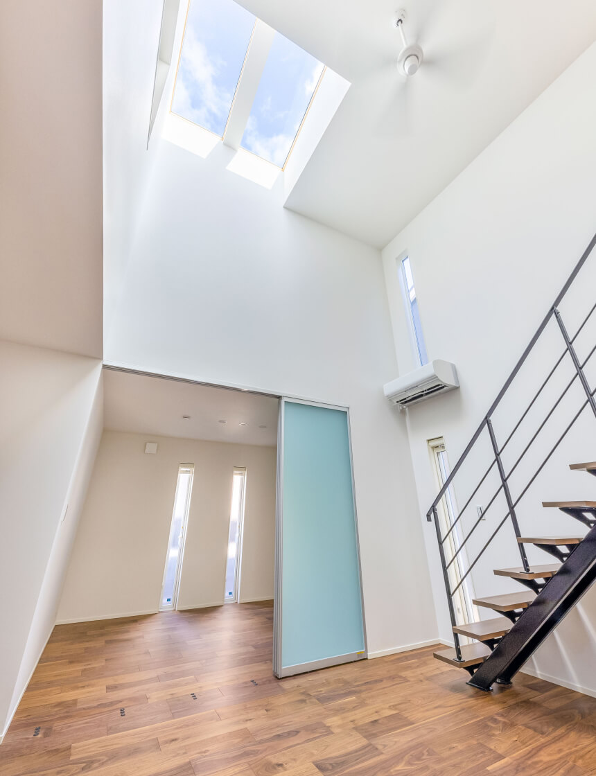 天窓から差し込む光は1階まで明るく照らし、白色の壁は光をよく反射し、室内をより明るく広く感じさせてくれます。