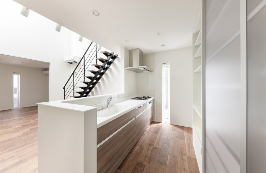 キッチンの背後にはたっぷりと収納を確保し、家電や食器類をすっきり片付けられます。
