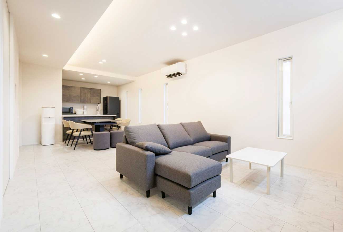 大きな窓や吹抜けを設けていないため、リビングの広がりや開放感を演出する為の「間接照明」や「天井高」の工夫も取り入れました。